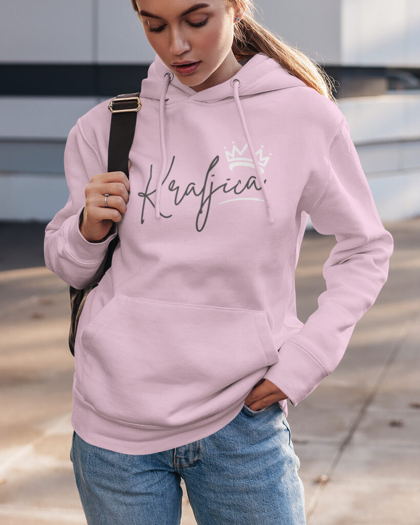 Roza hoodie “Kraljica” – udobna, mehka in trendovska jopa s kapuco, popolna za sproščene dni ali kot darilo za vse kraljice. Izdelana iz kakovostnega materiala, z napisom Kraljica in elegantno krono, ki dodata pridih ponosa in samozavesti. Odlična izbira za vsakodnevno nošenje, doma, v mestu ali na kavici z družbo.