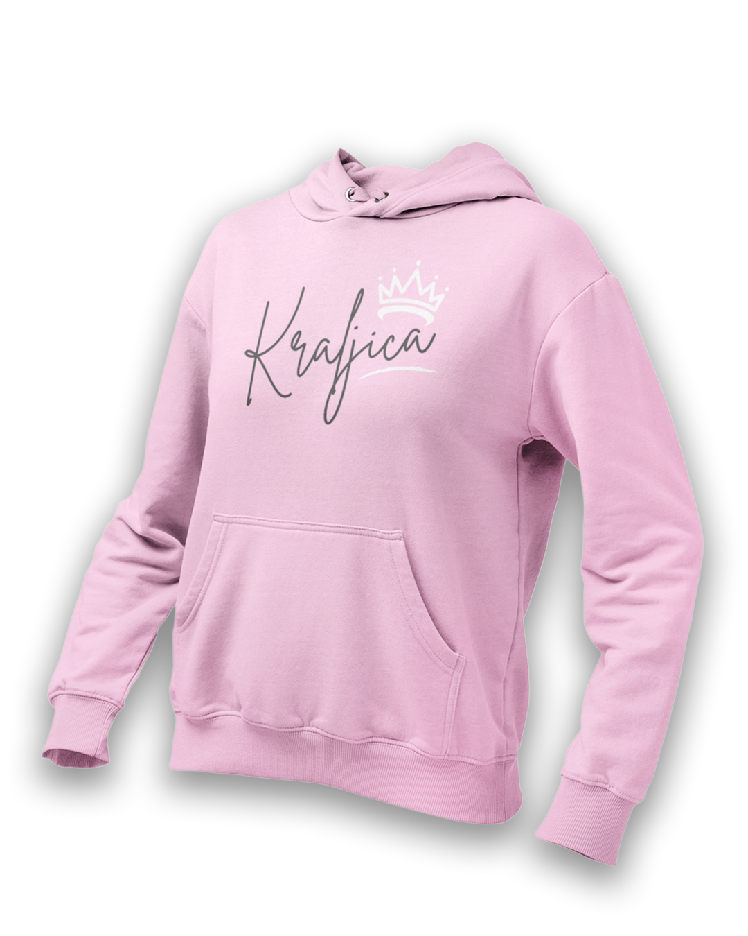 Roza hoodie “Kraljica” – udobna, mehka in trendovska jopa s kapuco, popolna za sproščene dni ali kot darilo za vse kraljice. Izdelana iz kakovostnega materiala, z napisom Kraljica in elegantno krono, ki dodata pridih ponosa in samozavesti. Odlična izbira za vsakodnevno nošenje, doma, v mestu ali na kavici z družbo.