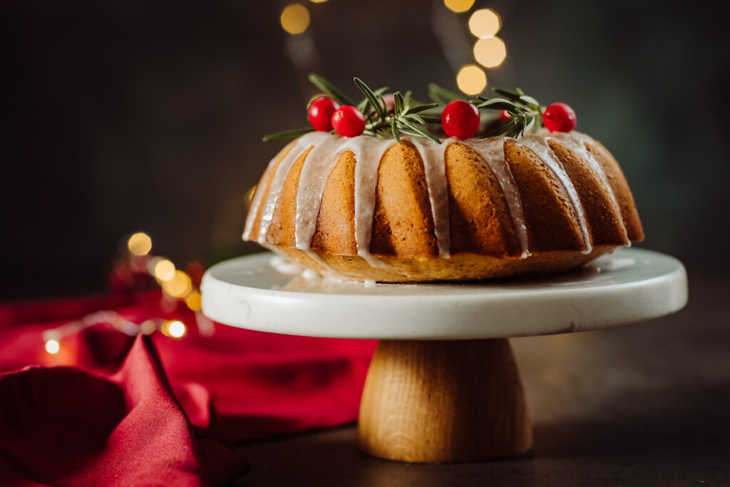 Prelijemo čez pečen kolač, po želji okrasimo z rožmarinovo vejico in rdečim jagodičevjem in postrežemo.