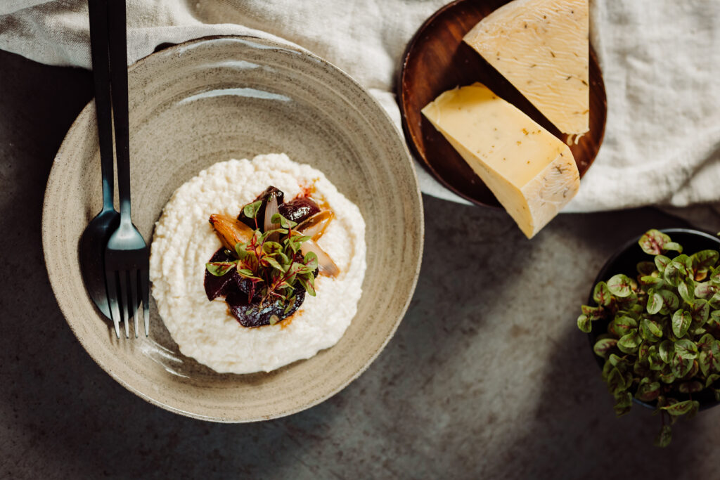 Postrežemo pire, dodamo pečeno peso in sveža zelišča.